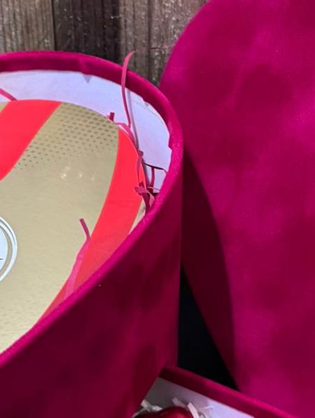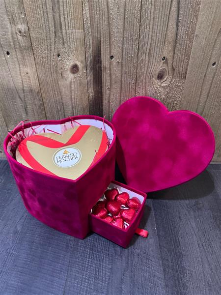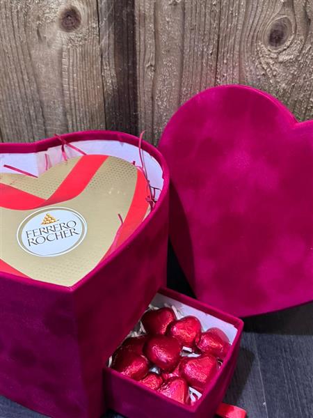 A red Velvet heart shaped gift box with a heart shaped Ferrero Rocher and a dozen chocolate hearts in a secret hidden drawer.