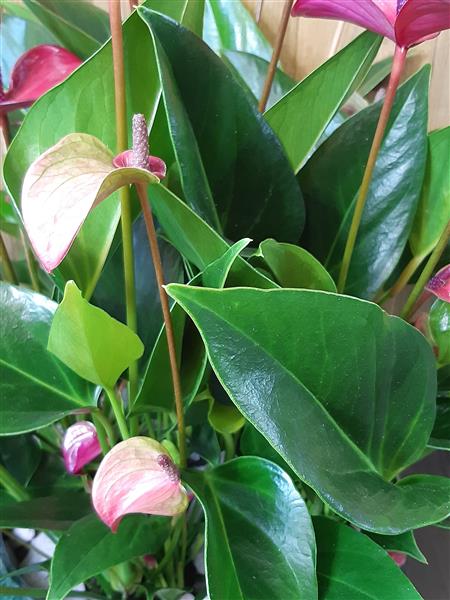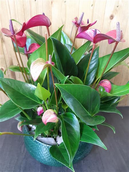 Anthuriums planted in a large ceramic green bowl