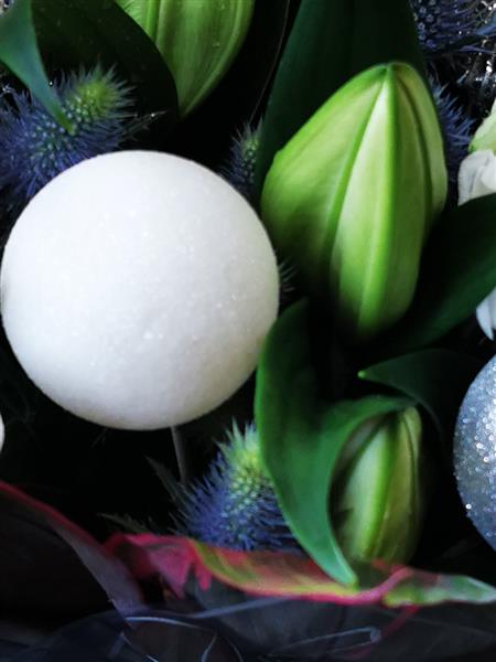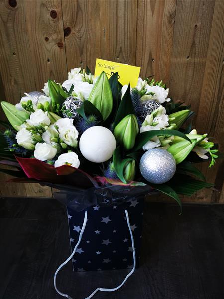 A handtied bouquet in a dark blue bag decorated with silver stars with mixed white flowers, silver foliages, baubles and woven knots