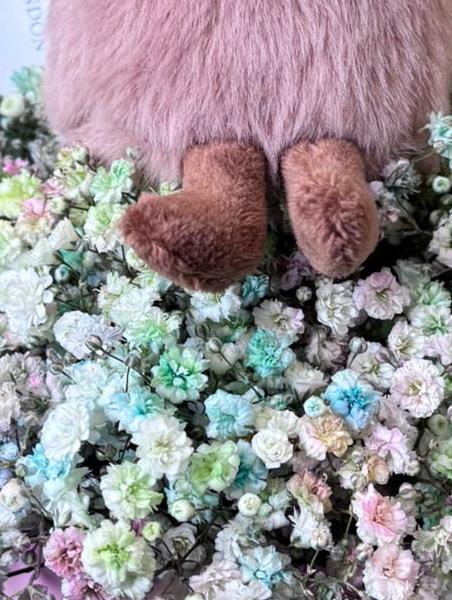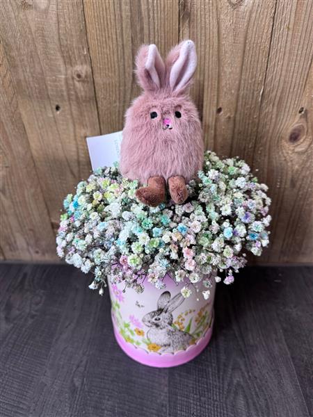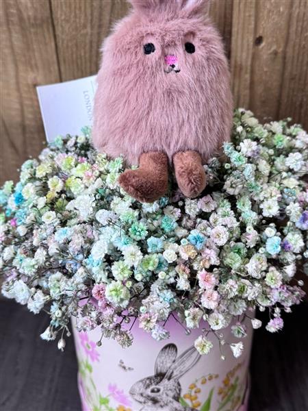 A tall hat box design with a fluffy bed of rainbow gypsophlia and a cute soft bunny 🐰
