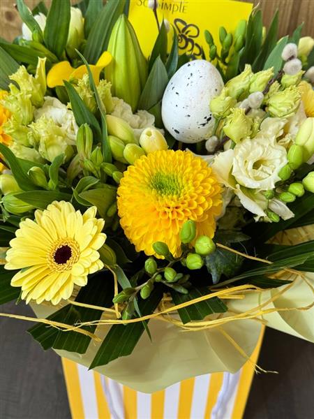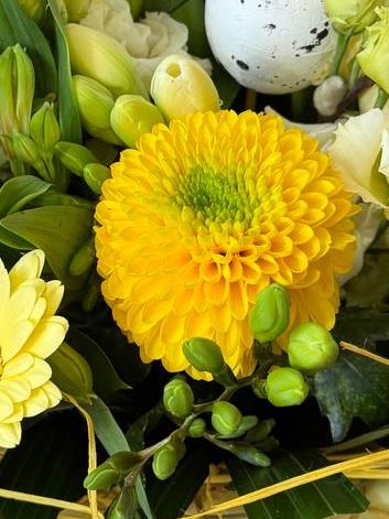‘Candy’ a fresh and bright combination of creams, whites and yellows with seasonal pussy willow and sisal collar, a pertect April gift 💛