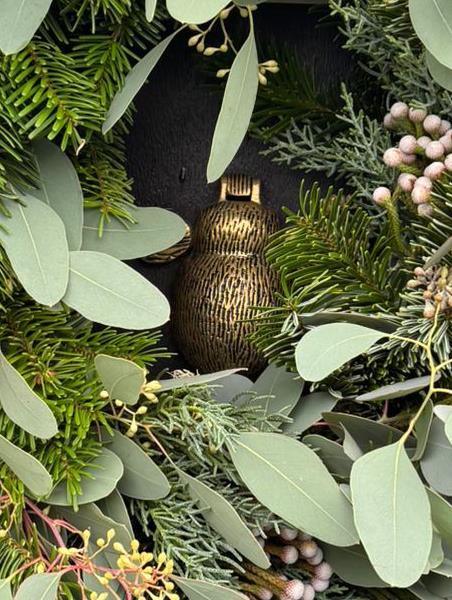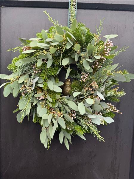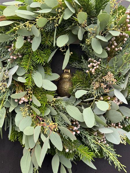 A pine based door decoration with mixed seasonal foliages. Standard size is 14" base, large is 16" base and extra large is 20" base.