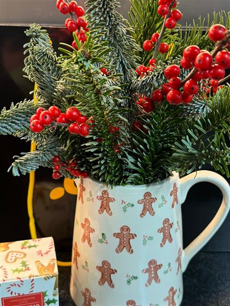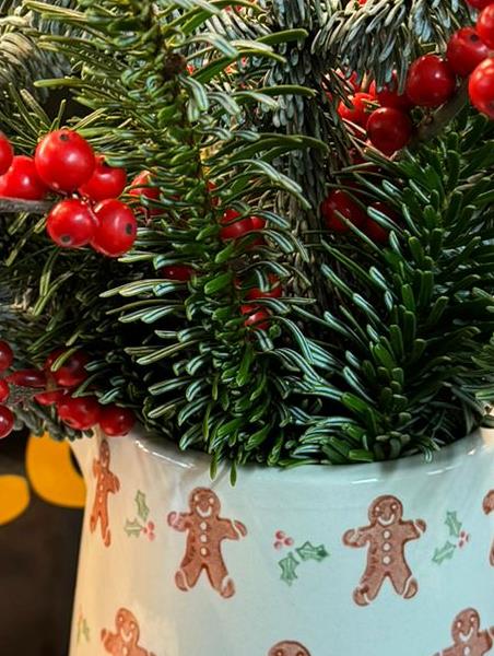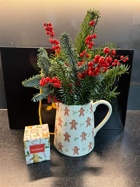 Gisela Graham festive ginger bread jug with matching candle and an eco tied blue spruce and berry bunch ready to pop into the jug gift collection. This collection comes wrapped in paper/tissue presented in a Beehive Florist branded bag