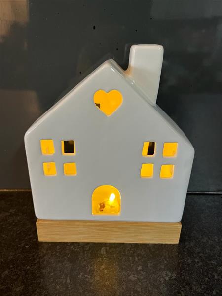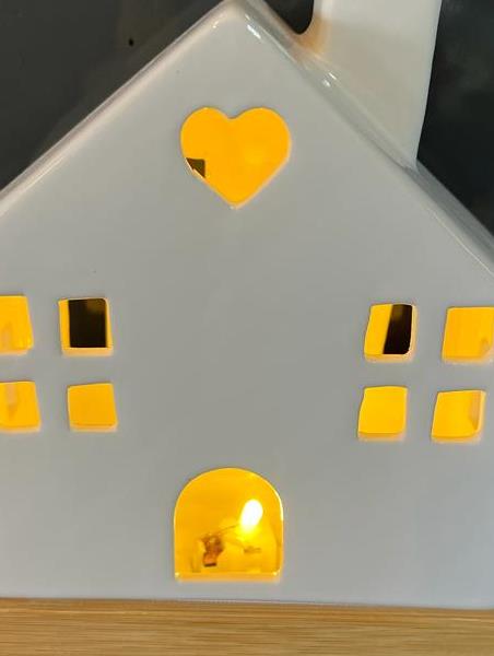 Beautiful decorative houses with LED light and battery included. Small is 14cm (5.5inches), large is 17.5cm (7 inches).
