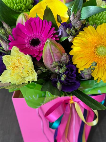 ‘Maypole’ A fun and vibrant selection of flowers hand tied in water with a mixed satin bow symbolising the interplay of life, love and the eternal cycle of seasons 🩷💛💜💚
