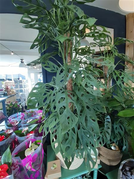 Monstera Plant on Moss Pole in wicker pot 1