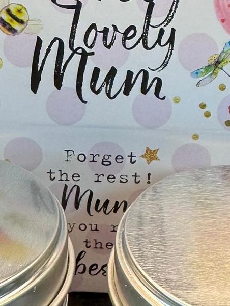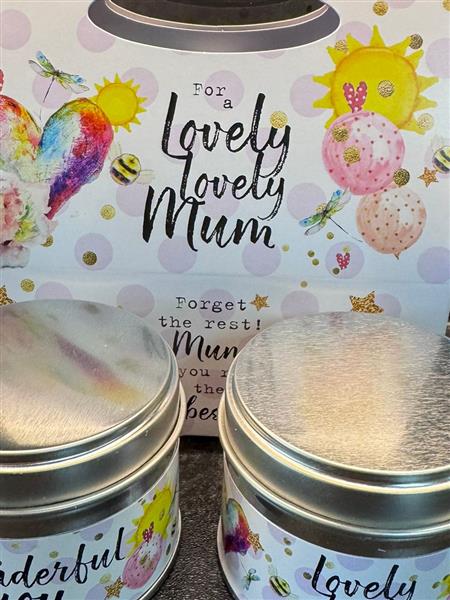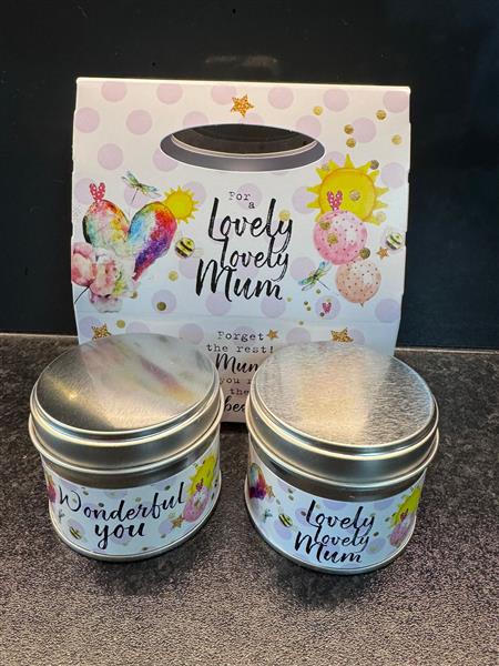 This gift box contains a 'Lovely lovely Mum' candle and a 'Wonderful You' candle.