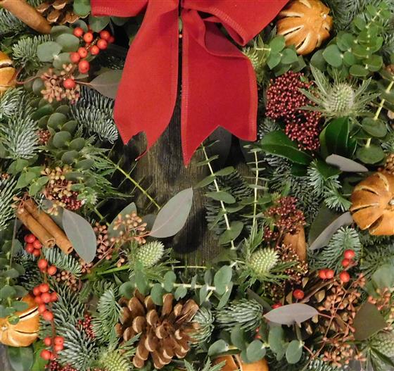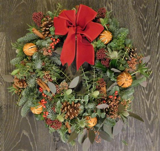 A beautifully decorated door decoration that includes Cinnamon, dried oranges and Eucalyptus.