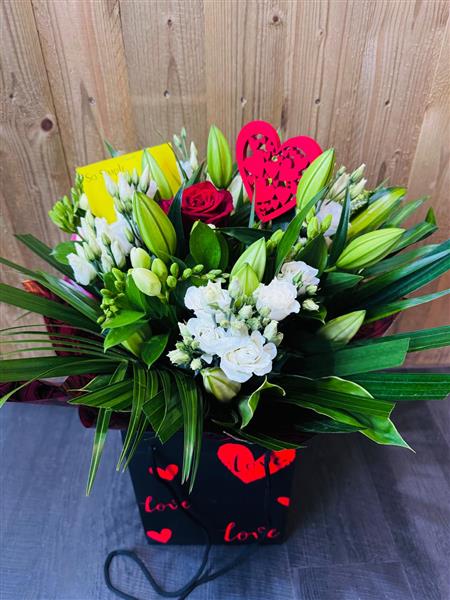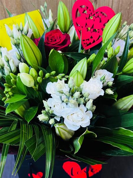 A romantic Hand Tied with one red rose in the middle cuddled by a seasonal selection of white flowers