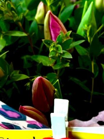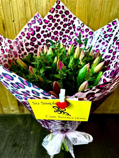 30 stems pink tulips and eucalyptus tied (not in water), wrapped in pink Leopard skin cellophane.