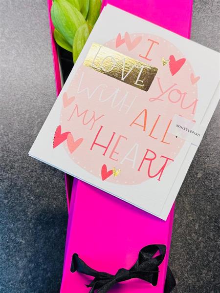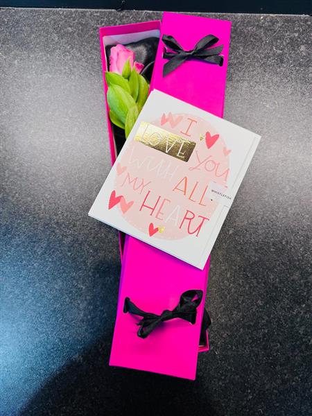 ‘Our Secret’ a single pink rose with a stem a foliage, hidden from view in a hot pink box complete with a valentines greetings card for your special message