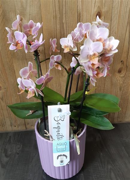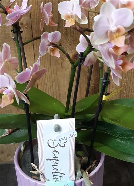 A lovely small headed orchid in a pink decorative ceramic pot. Flowers for a very long tome