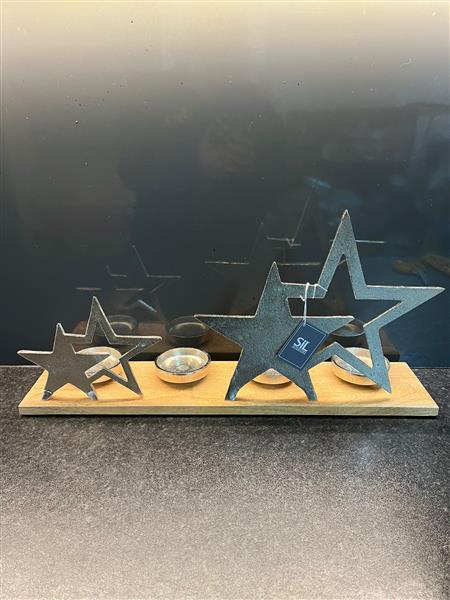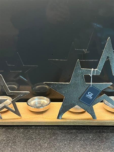 A 53cm long (22inches) and 27cm wide (11inches) wood with space for 4 tea lights and with decorative stars. Beautiful and very well made.