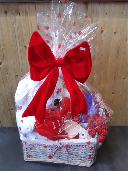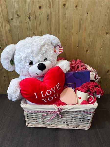 A beautiful Extra large Teddy (24"), a large box of milk tray chocolates, a Gisela Graham cup with a heart motif, a Gisela Graham jewellery box, a bunch of silk roses, a decorative heart and a Gisela Graham Throw, gift-wrapped with a luxury velvet bow.