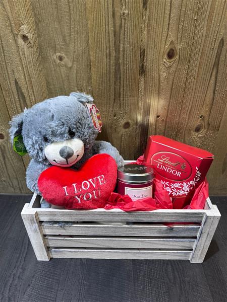 A beautiful grey bear holding an I Love You heart, a large box of Lindt Lindor and a ‘True Love’ scented candle by Best Kept Secrets. Presented in cellophane gift wrap and bow.